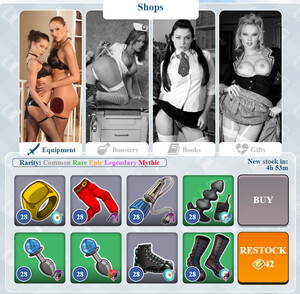 You can choose amongst various equipment items from the Shop. Each one of them has a certain effect on your stats. In order to be stronger in battles, you will have to choose a class and buy equipment and boosters to make your performances against the villains and other players the best possible. But you should also shop for your girls! Books give your girls experience points and Gifts help them level up, which means more Cash for you.